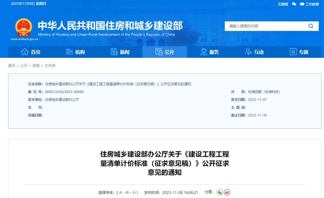 11月8日,住建部发布关于《建设工程工程量清单计价标准(征求意见稿)》公开征求意见的通知。其中提出:
